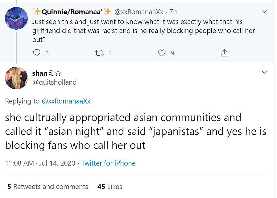 One person accused Stan of blocking individuals who are accusing his rumored girlfriend of racism.