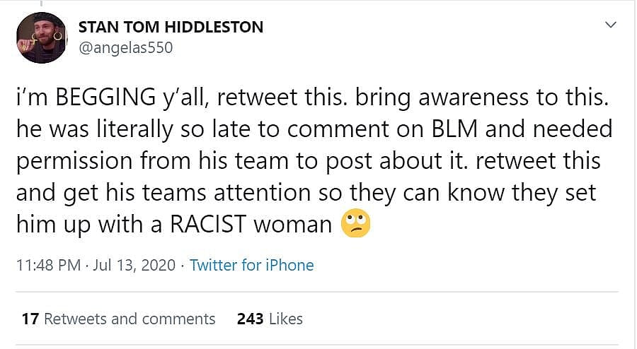 Angelas550 wrote, “i’m BEGGING y’all, retweet this. bring awareness to this. he was literally so late to comment on BLM and needed permission from his team to post about it. retweet this and get his teams attention so they can know they set him up with a RACIST woman”