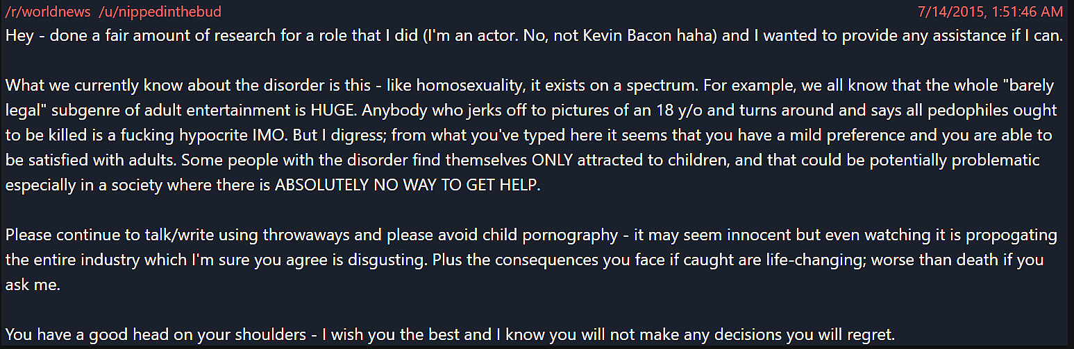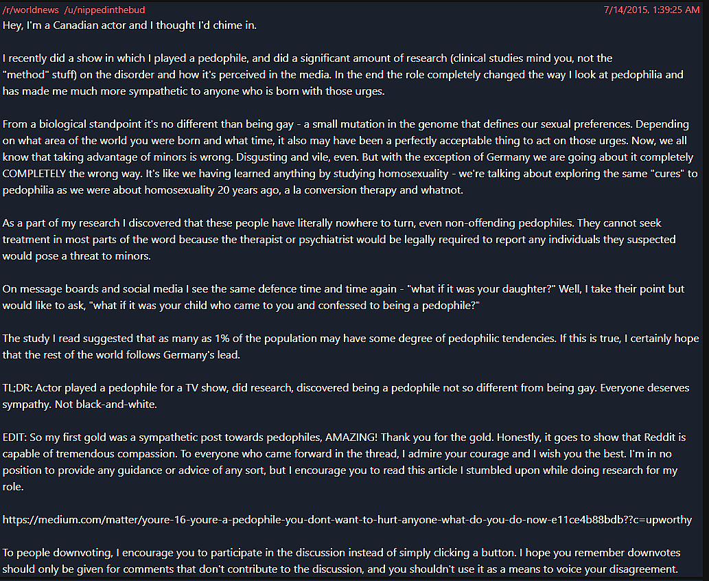 In an edit to the post he added, “EDIT: So my first gold was a sympathetic post towards pedophiles, AMAZING! Thank you for the gold. Honestly, it goes to show that Reddit is capable of tremendous compassion. To everyone who came forward in the thread, I admire your courage and I wish you the best. I’m in no position to provide any guidance or advice of any sort, but I encourage you to read this article I stumbled upon while doing research for my role.”