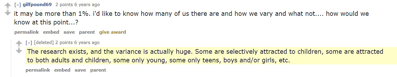 Liu answered, “The research exists, and the variance is actually huge. Some are selectively attracted to children, some are attracted to both adults and children, some only young, some only teens, boys and/or girls, etc.”