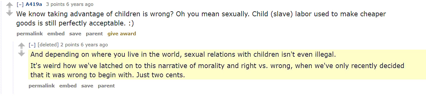 Liu responded, “And depending on where you live in the world, sexual relations with children isn’t even illegal. It’s weird how we’ve latched on to this narrative of morality and right vs. wrong, when we’ve only recently decided that it was wrong to begin with. Just two cents.”