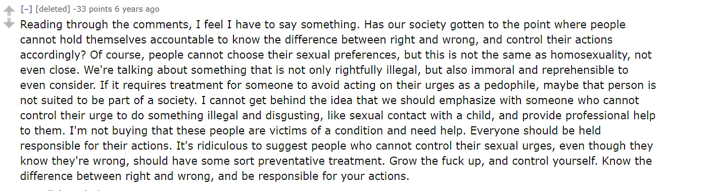 The user continued, “We’re talking about something that is not only rightfully illegal, but also immoral and reprehensible to even consider. If it requires treatment for someone to avoid acting on their urges as a pedophile, maybe that person is not suited to be part of a society. I cannot get behind the idea that we should emphasize with someone who cannot control their urge to do something illegal and disgusting, like sexual contact with a child, and provide professional help to them.”