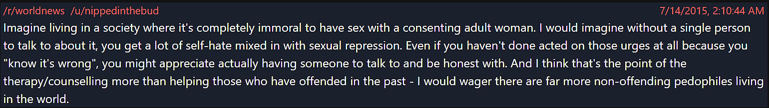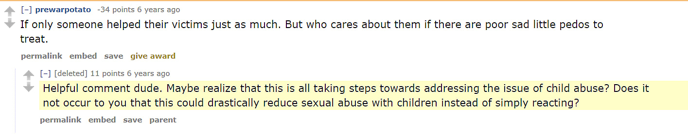 In the WorldNews subreddit Liu would respond to a BBC article shared in the subreddit with a user submitted headline that reads, “Germany encourages pedophiles to sign up for confidential treatment, even if they have abused a child, and doctors are hailing it as a success.”