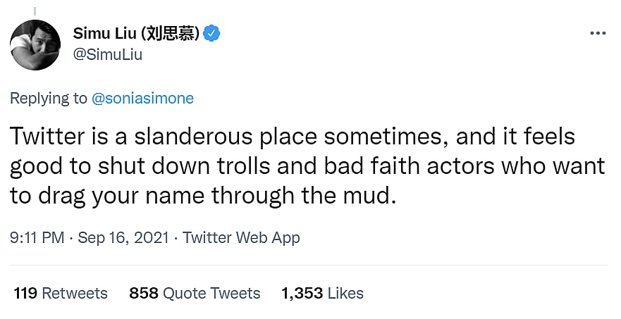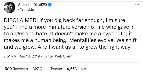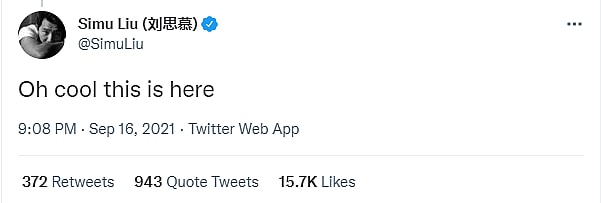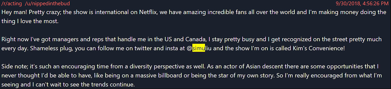 In a post in acting subreddit from September 2018, the user again confirmed he was Simu Liu and encouraged people to follow him on Instagram and Twitter.