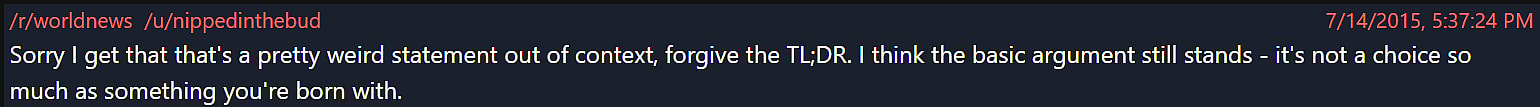 In response to a deleted comment, Liu wrote, “Sorry I get that that’s a pretty weird statement out of context, forgive the TL;DR. I think the basic argument still stands – it’s not a choice so much as something you’re born with.”