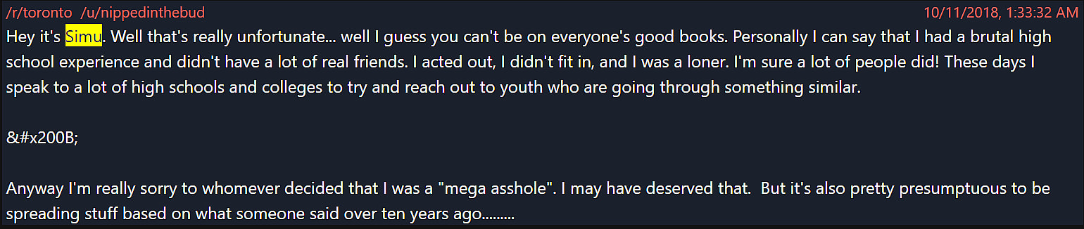 In another post from October 2018 in the toronto subreddit, he wrote, “Hey it’s Simu. Well that’s really unfortunate… well I guess you can’t be on everyone’s good books.”