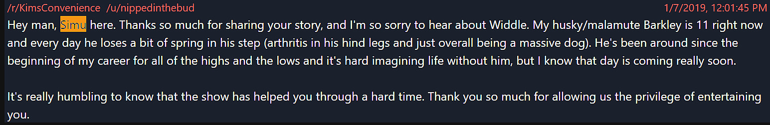 In one post from October 2019, in the KimsConvenience subreddit, the user writes, “Hey man, Simu here. Thanks so much for sharing your story, and I’m so sorry to hear about Widdle. My husky/malamute Barkley is 11 right now and every day he loses a bit of spring in his step (arthritis in his hind legs and just overall being a massive dog).”