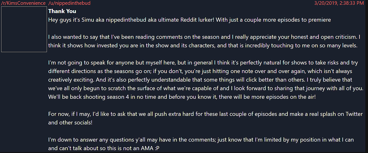 He wrote, “Hey guys it’s Simu aka nippedinthebud aka ultimate Reddit lurker! With just a couple episodes to premiere.”