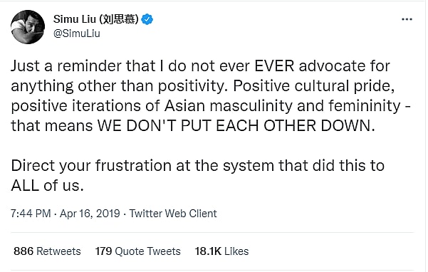 At the time he wrote, “Just a reminder that I do not EVER advocate for anything other than positivity. Positive cultural pride, positive iterations of Asian masculinity and femininity – that means WE DON’T PUT EACH OTHER DOWN. Direct your frustration at the system that did this to ALL of us.”