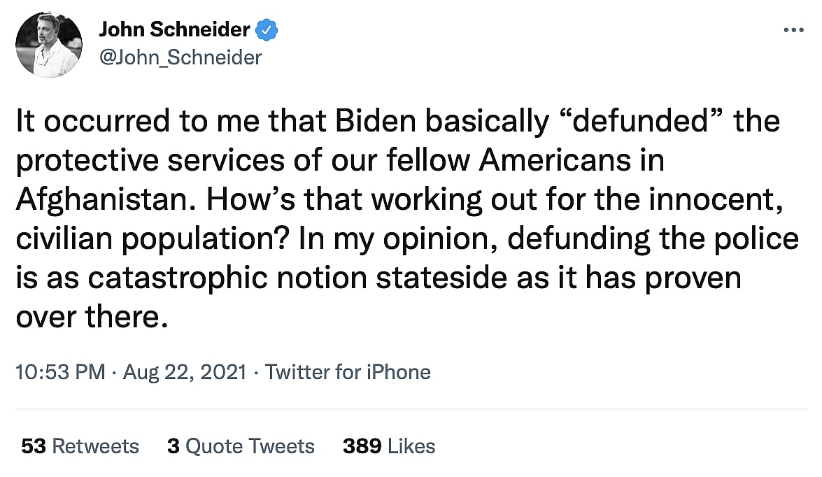 Turning to President Joe Biden’s botched withdrawal of American troops from Afghanistan, Schneider took to Twitter to warn his followers on what the actualization of a “Defund The Police” movement could mean for the country.