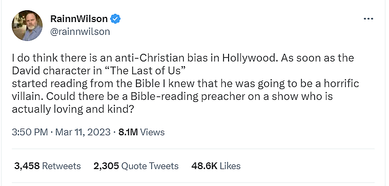 He wrote, “I do think there is an anti-Christian bias in Hollywood. As soon as the David character in The Last of Us started reading from the Bible I knew that he was going to be a horrific villain.”