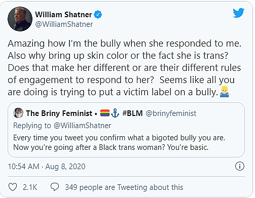 This led Shatner to assert that “all you’re doing is trying to put a victim label on a bully.”