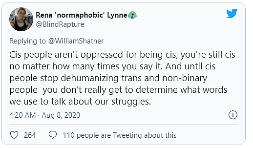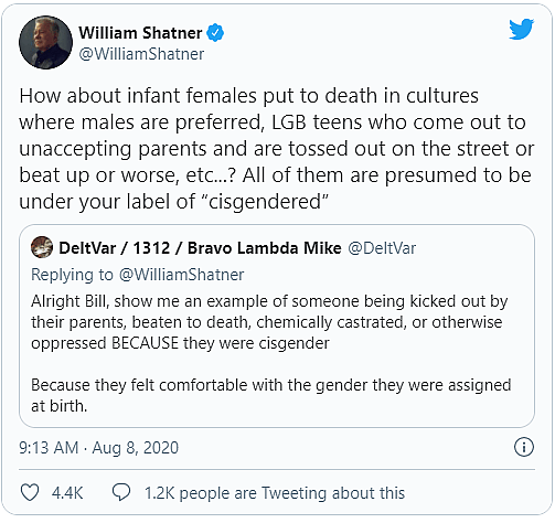 This luring attempt was ultimately unsuccessful, as Shatner readily put forth the examples of “infant females put to death in cultures where males are preferred, LGB teens who come out to unaccepting parents and are tossed out on the street or beat up or worse, etc…? All of them are presumed to be under your label of ‘cisgendered’.”