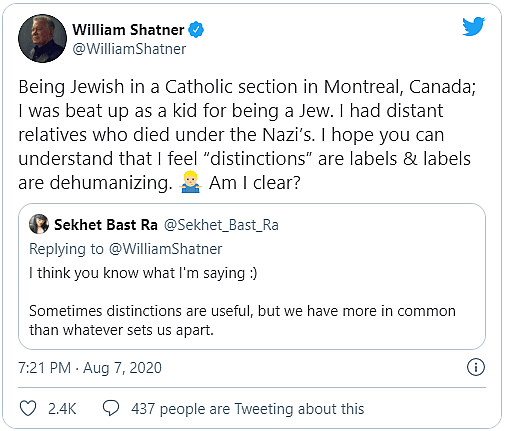 To counter Ra’s argument, Shatner would discuss his own childhood experience “being Jewish in a Catholic section of Montreal” and how identity based bullying and racism caused the actor to “feel “distinctions” are labels & labels are dehumanizing”