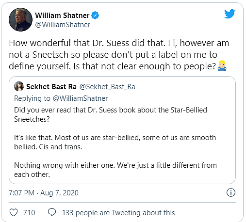 Shatner, in an example of his usual quick wit, replied, “How wonderful that Dr. Suess did that. I, however am not a Sneetsch so please don’t put a label on me to define yourself. Is that not clear enough to people?”