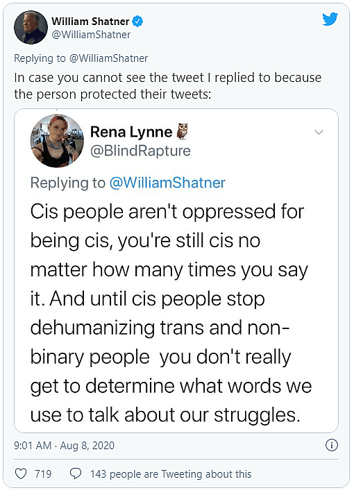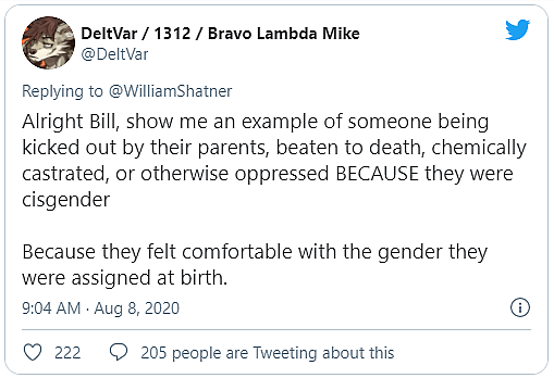 In an attempt to lure Shatner into a ‘gotcha’ moment, user @DeltVar demanded that the actor present “an example of someone being kicked out by their parents, beaten to death, chemically castrated, or otherwise oppressed BECAUSE they were cisgender.”
