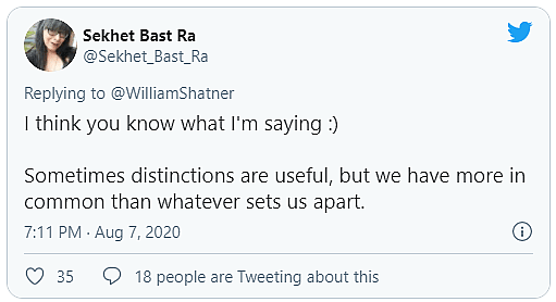 The day following this initial interaction, Shatner and Ra’s thread was discovered and quickly descended upon by Twitter activists eager to criticize Shatner for wrong think.