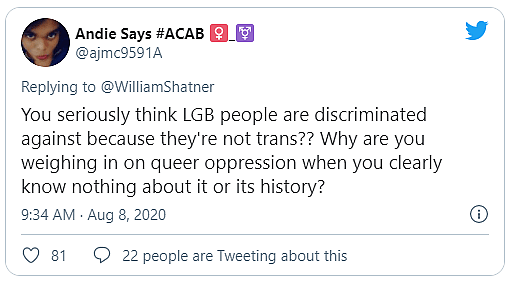 The criticisms continued, with one user dismissing Shatner by asking, “You seriously think LGB people are discriminated against because they’re not trans?? Why are you weighing in on queer oppression when you clearly know nothing about it or its history”?