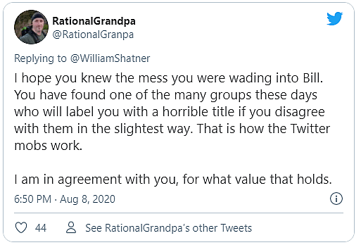 One user came to Shatner’s defense. @RationalGranap said, “I hope you knew the mess you were wading into Bill. You have found one of the many groups these days who will label you with a horrible title if you disagree with them in the slightest way. This is how the Twitter mobs work. I am in agreement with you, for what values that holds.”