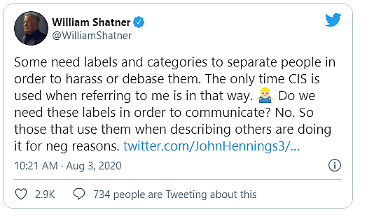 Bill Shatner, still somehow not tired after fighting off the alphabet mob replied, “I didn’t but let them label. They’d be foolish to do so. The only facts they can derive is that I do not appreciate the term CIS used to label others and myself. If that’s going to cause them to call me names then they are the ones with the issues; not me.”