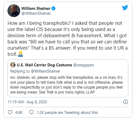 User @swagspan would call on Shatner to “please stop with the transphobia” and declared that “it’s not your place to tell trans folk what is and is not offensive.”