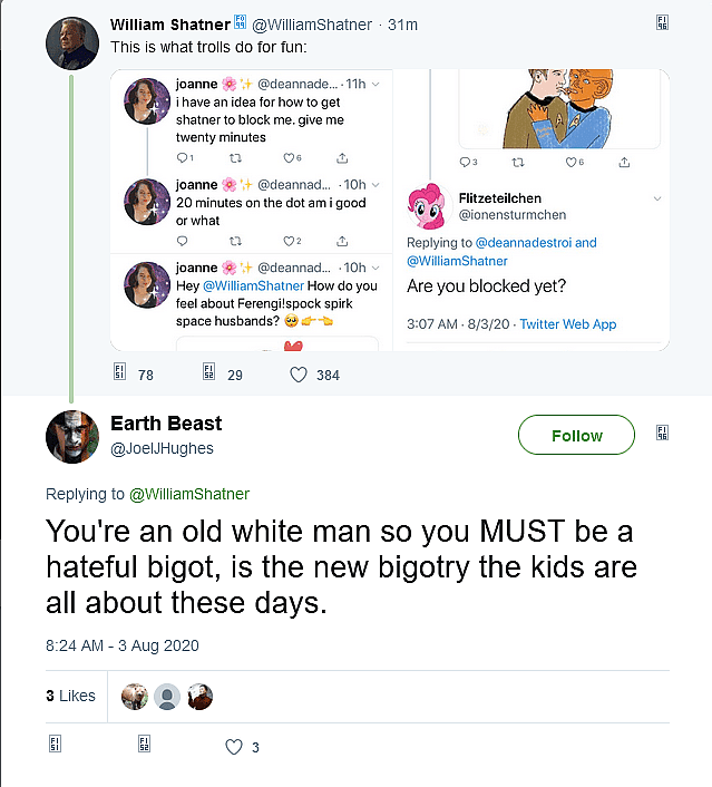 On August 3rd, Shatner shared a screenshot featuring users discussing how to get the veteran actor to block them on social media, particularly by creating crude drawings of Captain Kirk engaged in sexual situations with a Ferengi dressed as Spock.