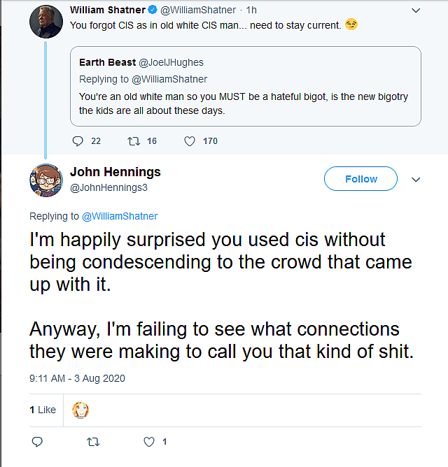 Shatner, going along with the joke, added, “You forgot CIS as in old white CIS man…need to stay current.”