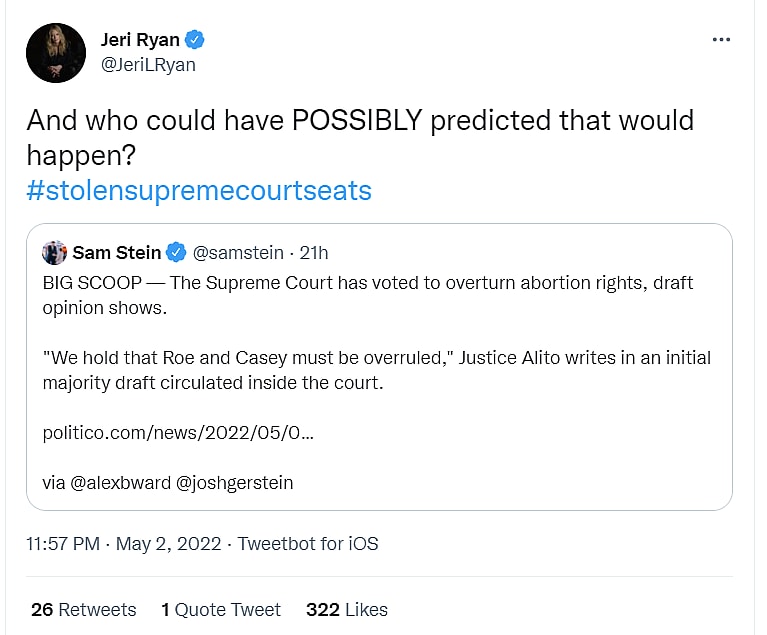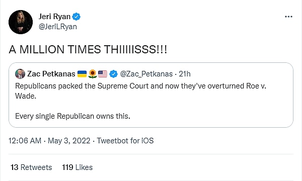 She responded to a tweet from Zac Petkanas that stated, “Republicans packed the Supreme Court and now they’ve overturned Roe v. Wade. Every single Republican owns this.”