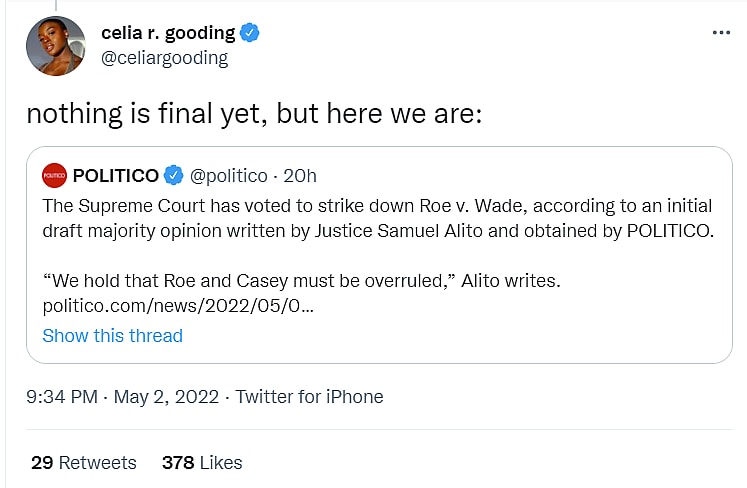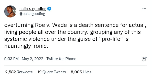 Gooding reacted to this news and the leaked opinion writing on Twitter, “overturning Roe v. Wade is a death sentence for actual, living people all over the country.”