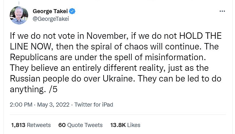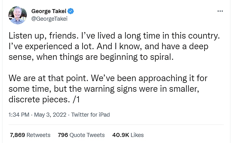 Takei would later tweet, “With the news of the draft SCOTUS ruling leaked, it is more important than ever that we mobilize to protect the right to an abortion.”