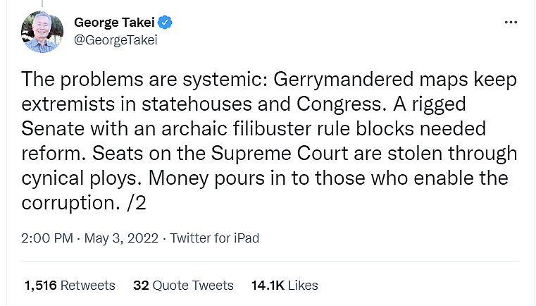 Takei went on to claim that Supreme Court seats have been stolen. “The problems are systemic: Gerrymandered maps keep extremists in statehouses and Congress. A rigged Senate with an archaic filibuster rule blocks needed reform,” he tweeted.