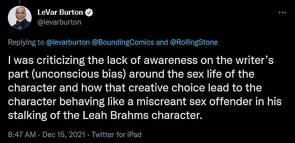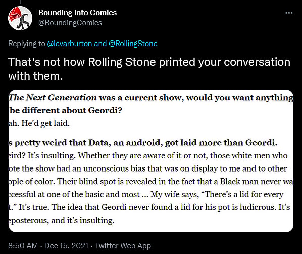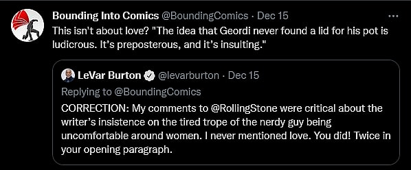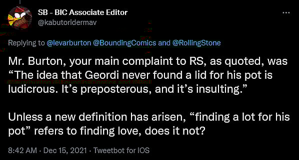 At the same time, Editor-in-Chief John F. Trent, writing from the official Bounding Into Comics Twitter account, also reflected Burton’s own words back at him, asking, “This isn’t about love? ‘The idea that Geordi never found a lid for his pot is ludicrous. It’s preposterous, and it’s insulting.’”