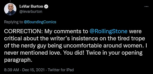 Surprisingly, shortly after the article was published on December 15th, Burton himself replied to Bounding Into Comics’ official Twitter account writing, “CORRECTION: My comments to @RollingStone were critical about the writer’s insistence on the tired trope of the nerdy guy being uncomfortable around women. I never mentioned love. You did! Twice in your opening paragraph.”