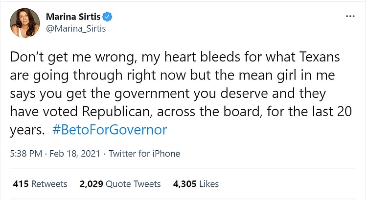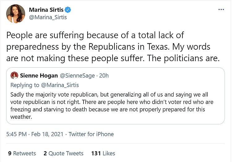 “People are suffering because of a total lack of preparedness by the Republicans in Texas,” she added. “My words are not making these people suffer. The politicians are.”