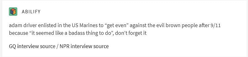 One user wrote “Adam Driver enlisted in the US Marines to “get even” against the evil brown people after 9/11 because “it seemed like a badass thing to do”, don’t forget it.”