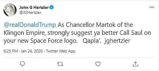 And John G Hertzler wrote, “Donald Trump, as Chancellor Martok of the Klingon Empire, strongly suggest ya better Call Saul on your new Space Force logo. Qapla’ jghertzler.”