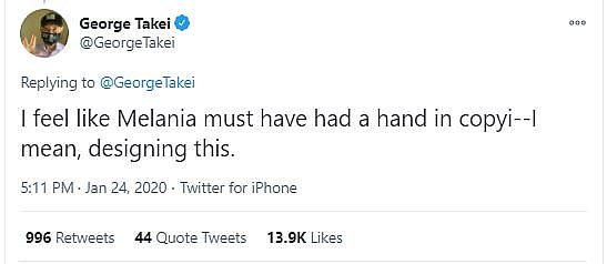 Takei added in a subsequent tweet, “I feel like Melania must have had a hand in copy–I mean, designing this.”