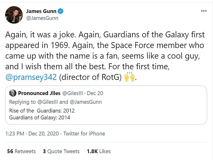 He would then reiterate he was joking writing, “Again, it was a joke. Again, Guardians of the Galaxy first appeared in 1969. Again, the Space Force member who came up with the name is a fan, seems like a cool guy, and I wish them all the best.”