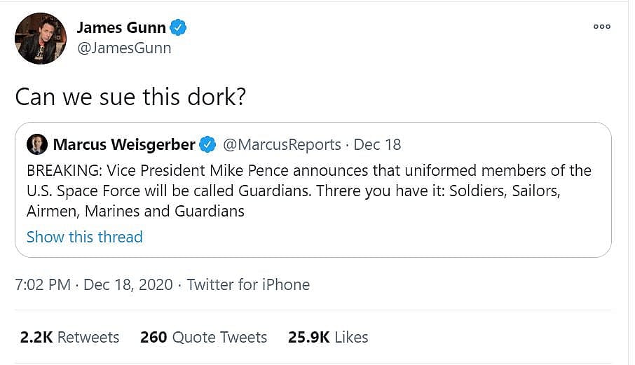 The calls to sue would seemingly die down for about a year. That’s when Guardians of the Galaxy director James Gunn decided to take issue with Vice President Mike Pence revealing what Space Force members will be called.