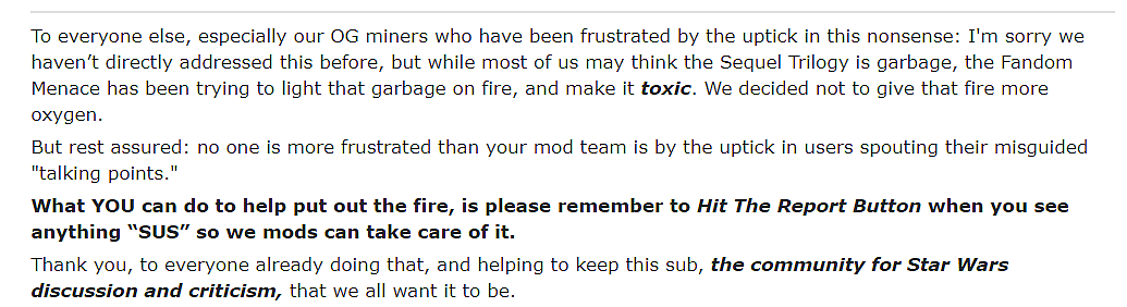 “But rest assured: no one is more frustrated than your mod team is by the uptick in users spouting their misguided ‘talking points.’ What YOU can do to help put out the fire, is please remember to Hit The Report Button when you see anything ‘SUS’ so we mods can take care of it.”