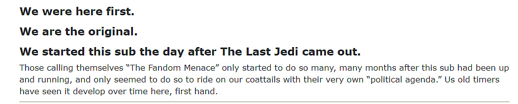 They write, “We were here first. We are the original. We started this sub the day after The Last Jedi came out.”