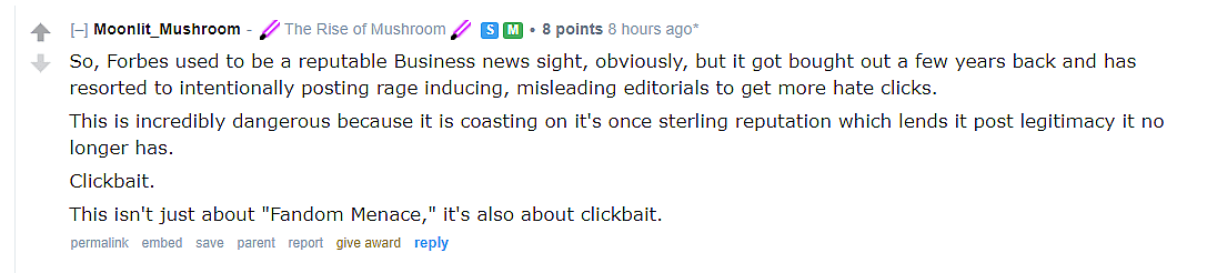 As for why Forbes was added to the list Moonlight Mushroom addressed that in the comments, “So, Forbes used to be a reputable Business news sight, obviously, but it got bought out a few years back and has resorted to intentionally posting rage inducing, misleading editorials to get more hate clicks.”