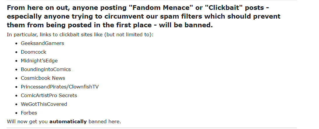 The moderator declares, “From here on out, anyone posting ‘Fandom Menace’ or ‘Clickbait’ posts – especially anyone trying to circumvent our spam filters which should prevent them from being posted in the first place – will be banned.”