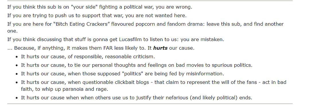 Regardless, Mushroom writes, “If you think this sub is on “your side” fighting a political war, you are wrong. If you are trying to push us to support that war, you are not wanted here. If you are here for “Bitch Eating Crackers” flavoured popcorn and fandom drama: leave this sub, and find another one. If you think discussing that stuff is gonna get Lucasfilm to listen to us: you are mistaken. Because, if anything, it makes them FAR less likely to. It hurts our cause.”