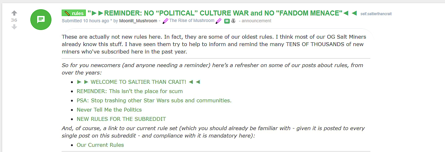 The Star Wars subreddit Saltier Than Crait has issued new guidelines for the forum banning anyone describing themselves as Fandom Menace as well as links to people they deem bad including Bounding Into Comics.