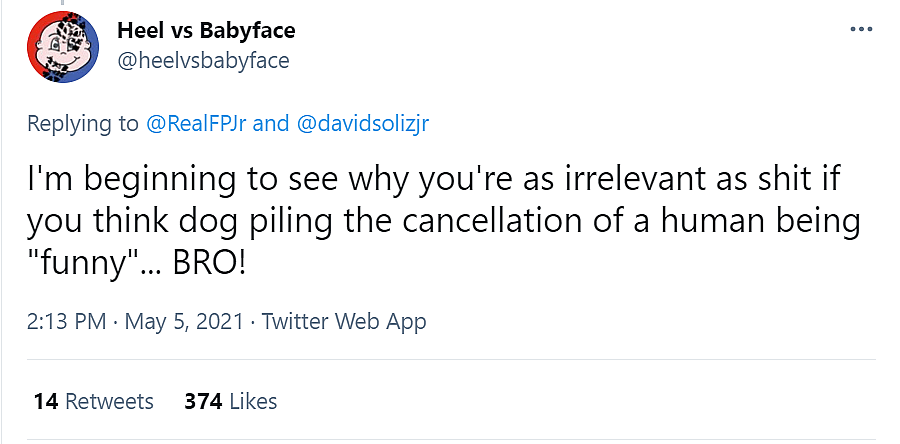 Heel vs Babyface responded, “I’m beginning to see why you’re as irrelevant as shit if you think dog piling the cancellation of a human being ‘funny’… BRO!”