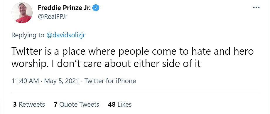 In response to another Twitter user, Prinze Jr. would write, “Twitter is a place where people come to hate and hero worship. I don’t care about either side of it.”