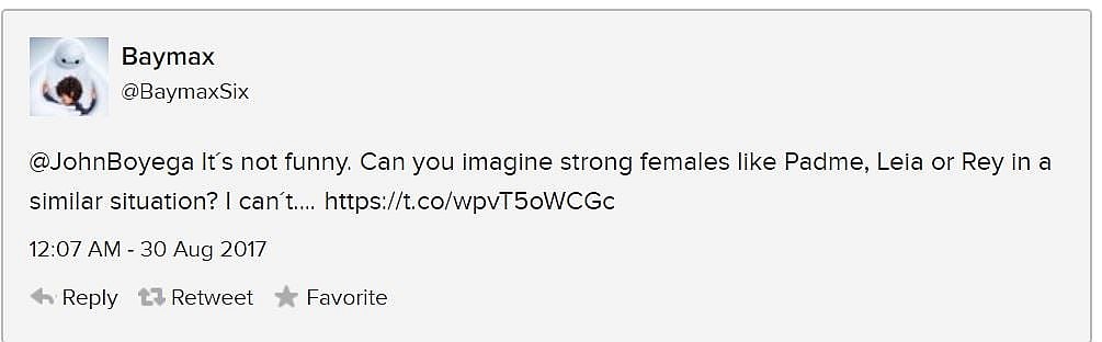 At least one Twitter user took issue with Boyega’s dance moves saying, “It’s not funny. Can you imagine strong females like Padme, Leia, or Rey in a similar situation? I can’t…”