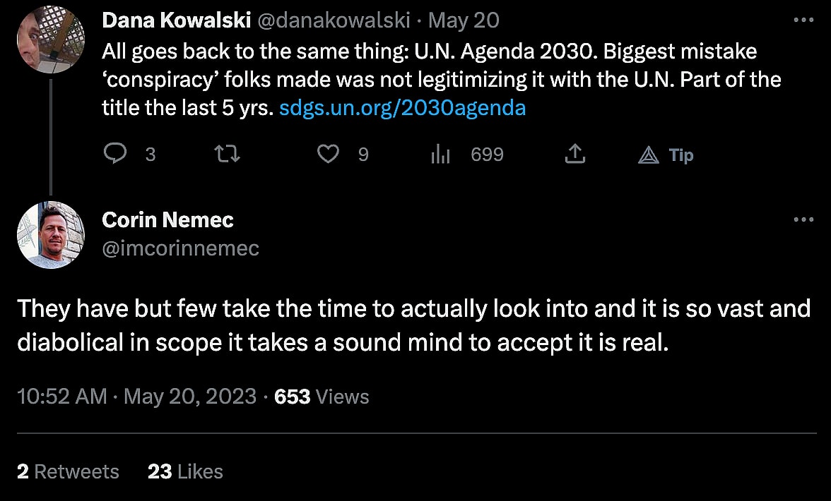 Replying to @danakowalski, who proposed, “All goes back to the same thing: U.N. Agenda 2030. Biggest mistake ‘conspiracy’ folks made was not legitimizing it with the U.N. Part of the title the last 5 yrs,” Nemec asserted, “They have but few take the time to actually look into and it is so vast and diabolical in scope it takes a sound mind to accept it is real.”