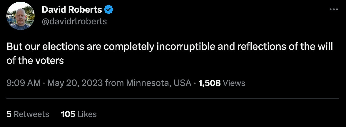 “But our elections are completely incorruptible and reflections of the will of the voters,” ironically noted @davidlroberts.